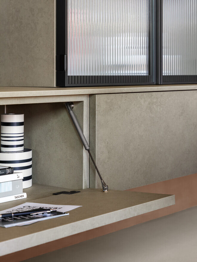 Panouri Modulor din beton opus și corp suspendat deschis Unoedue din beton opus cu uși City Glass din sticlă transparentă canelată cu ramă lustruită; corpuri de mobilier suspendate cu uși verticale Plana din beton opus, tip push&pull, corp de mobilier suspendat deschis Unoedue din beton opus.